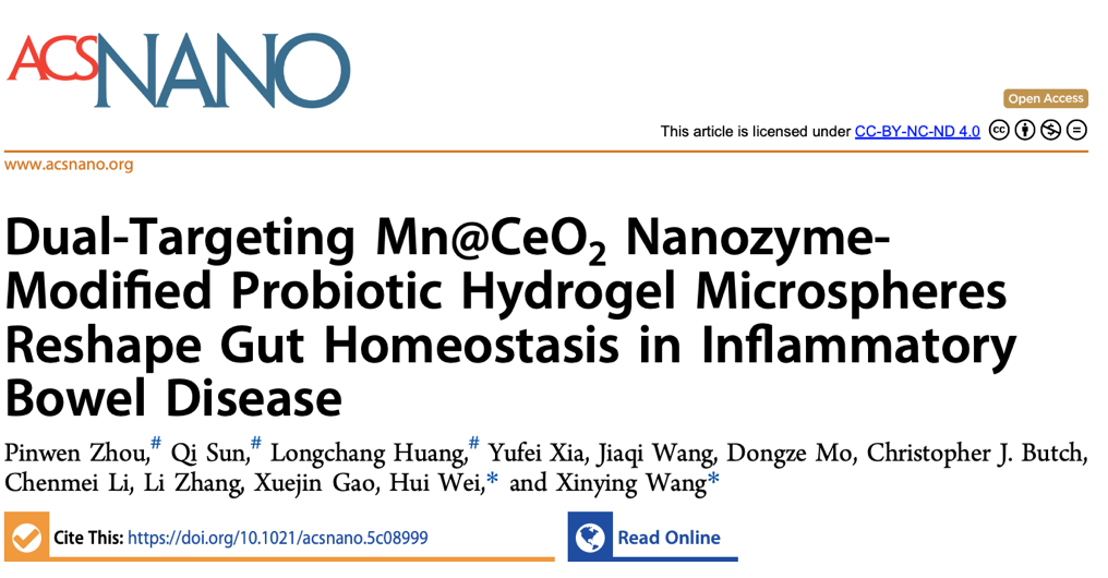 2025年8月25日,麻豆视频 附属金陵医院王新颖教授团队与麻豆视频 现代工程与应用科学学院魏辉教授团队合作,在《ACS Nano》在线发表了题为“Dual-Targeting Mn@CeO2 NanozymeModified Probiotic Hydrogel Microspheres Reshape Gut Homeostasis in Inflammatory Bowel Disease”的研究成果。该研究创新性构建的MnCe@LR/AMs递送系统,为炎症性肠病提供了全新的精准化、协同化治疗策略,有望推动 IBD 治疗从“单一干预”向“多维度协同”升级。该项研究得到了国家自然科学基金委、科技部、江苏省科技厅以及中央高校等基金的支持,并在相关研究方面得到合作实验室的大力协助与支持。
