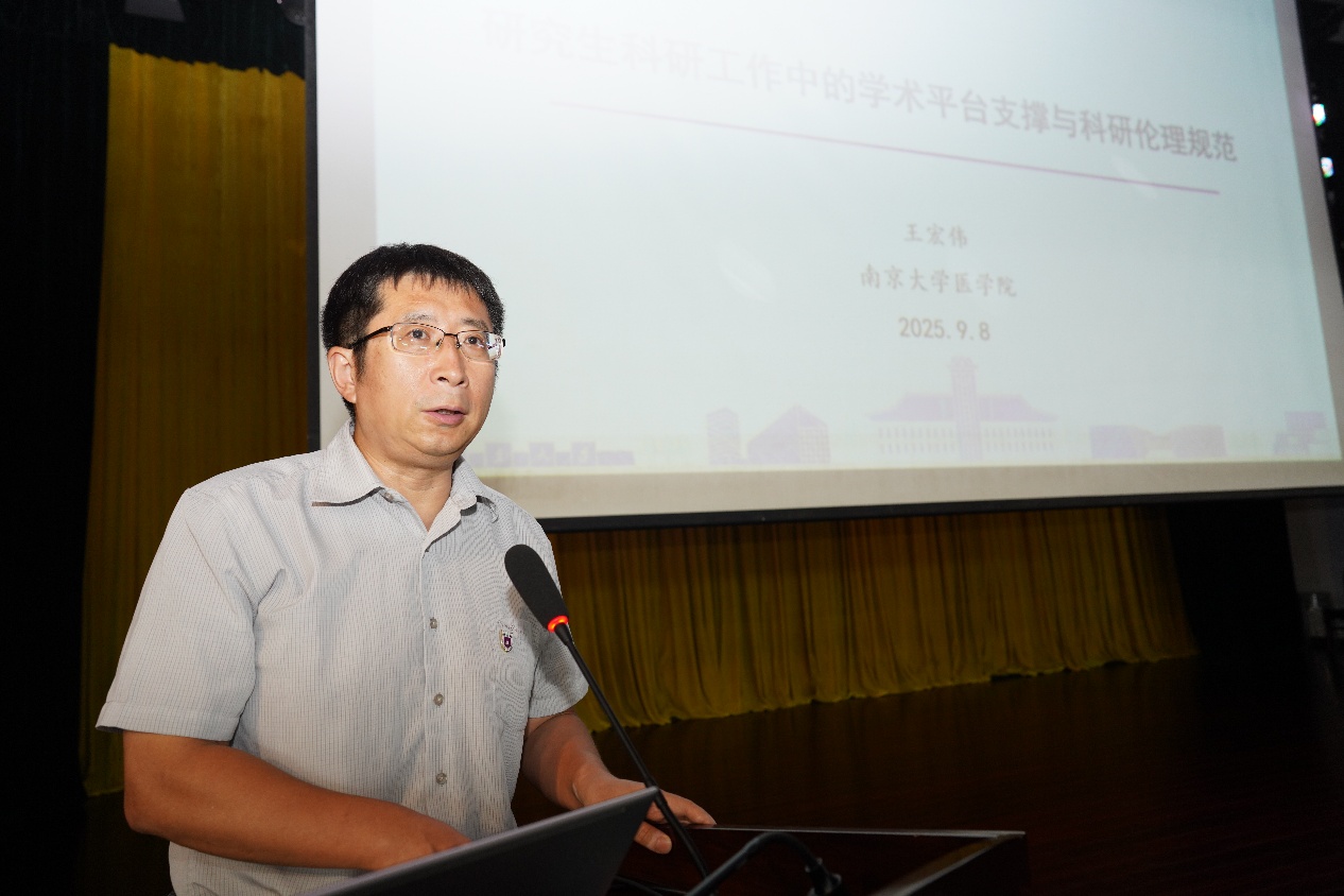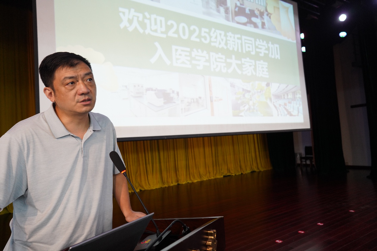 沈苏南代表麻豆视频 向全体新同学表示热烈欢迎,并以《心系“国家事”,肩扛“国家责”——做有担当的新时代医学青年》为题,为新生讲授“开学第一课”。他带领大家深入了解麻豆视频 的悠久历史与深厚底蕴以及麻豆视频 的发展历程。他强调,在中国人民抗日战争暨世界反法西斯战争胜利80周年之际,全体医学生要牢记习近平总书记给麻豆视频 留学归国青年学者的重要回信中的殷切嘱托,将个人理想融入国家需求,学好专业知识,积极进取、奋发有为,持续推进“奋进行动”,着力攻克医学领域的“卡脖子”难题。最后,他祝愿大家在紧张而充实的研究生阶段学有所成、收获满满。
