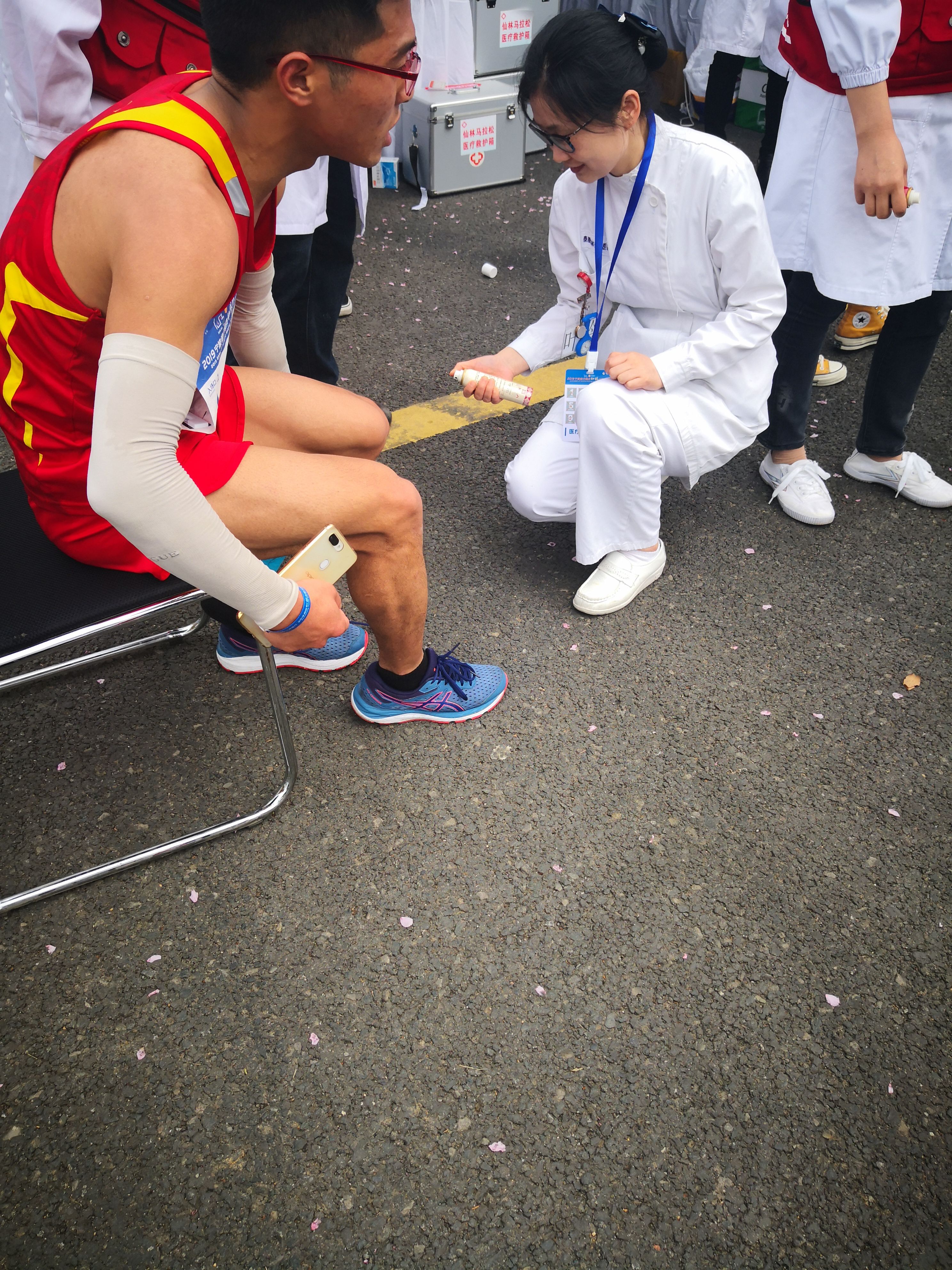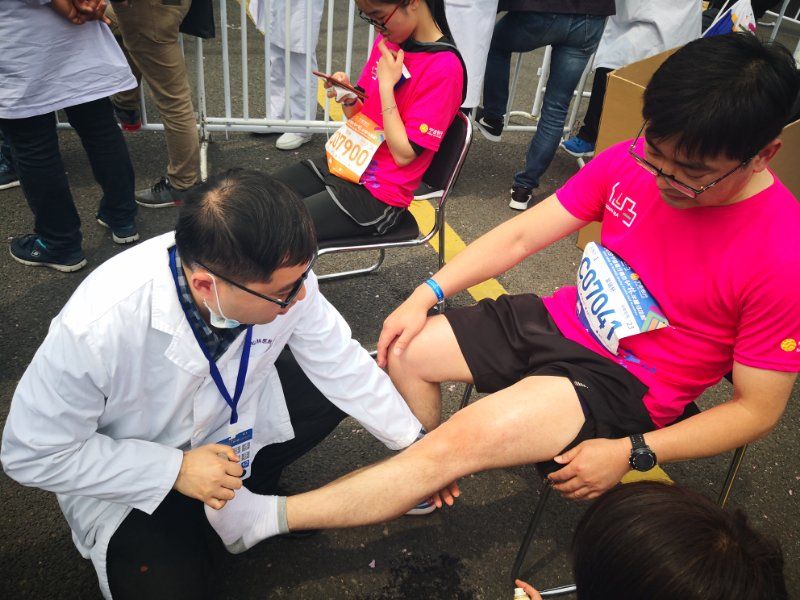 马拉松的起点和终点是事故高发地带,由我院医护人员参与的第1、13现场救治小组,在起(终)点羊山公园参与救治,另外第2、7小组跟随救护车提供保障。这4组医疗保障组由骨科、急诊科以及重症医学科医护人员组成,共计为200名 受伤选手提供现场救助,有擦伤、扭伤以及轻微中暑的患者得到及时的救治和转移。