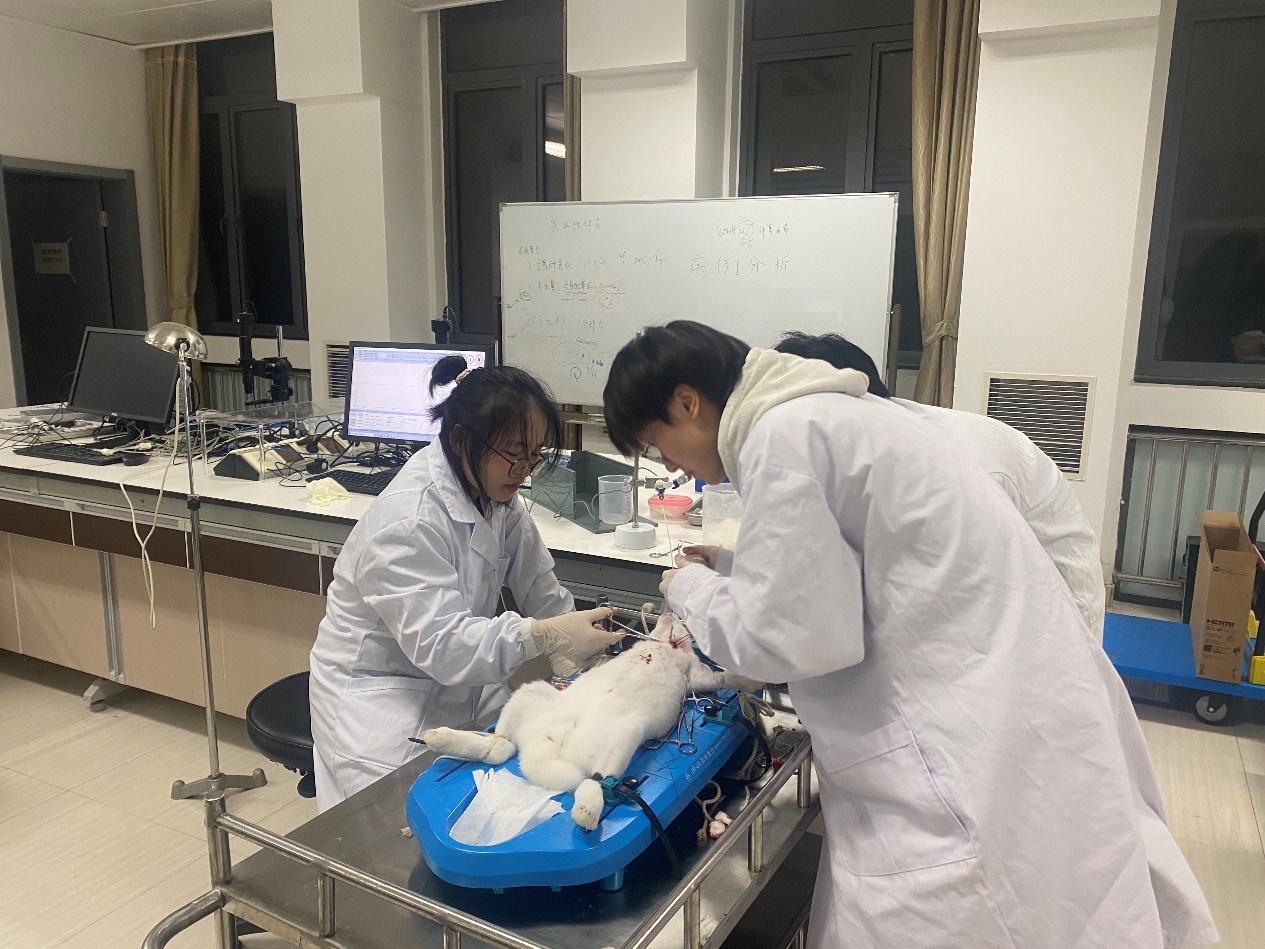 17 日上午,比赛正式拉开帷幕,首先进行了时长 1 小时的理论考试,涵盖解剖、组胚、病理、病原学标本识别理论考核及 ESP 虚拟标准化病人案例考核,全面考查学生对医学基础知识的理解与应用能力。随后的线下实操环节,要求选手在家兔身上进行休克模型复制操作,着重检验学生的动手能力、手术操作规范性及模型构建成功率。比赛中,两队同学沉着冷静、配合默契,凭借扎实的基本功和出色的应变能力圆满完成各项比赛。