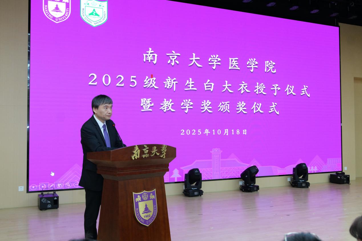 陆现彩代表学校向2025级新生表示热烈的欢迎和诚挚的问候,并对他们提出三点期望:一是坚守初心,担当使命。希望同学们牢记“健康所系,性命相托”的誓言,将个人理想融入国家医疗卫生事业,在服务“健康中国”战略中实现人生价值;二是追求卓越,锤炼本领。希望同学们珍惜时光,夯实基础理论,精进临床技能,主动融入跨学科平台,构建“医学+”复合型知识体系,成长为卓越医学人才;三是胸怀家国,勇毅前行。希望同学们传承红色基因,赓续报国传统,在推动科技自立自强、讲好中国医学故事中展现南大担当。最后,他指出,医学学科是麻豆视频 办好人民满意的教育的重要着力点,并号召全体师生凝心聚力,共同谱写南大医学教育的新篇章。