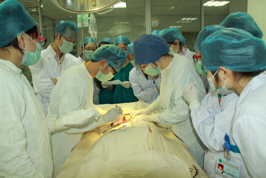临床医学2009级的学生进行动物外科手术教学活动。近日,医院史兆荣院长、王与荣副院长、医务部刘玉秀副主任、郑均副主任来到现场,观摩了动物外科手术教学。本次教学内容包括腹壁切开、小肠部分切除、胃肠吻合、阑尾切除、脾切除、清创缝合等六个类型的常规手术,每名学生在带教老师的指导下轮流担任主刀医生、第一助手、麻醉医师和器械护士的角色。经过两个月的手术基本功训练,和近一周的动物手术操作实践,同学们娴熟的手术操作,镇静自如的神情,给院领导留下了深刻的印象。