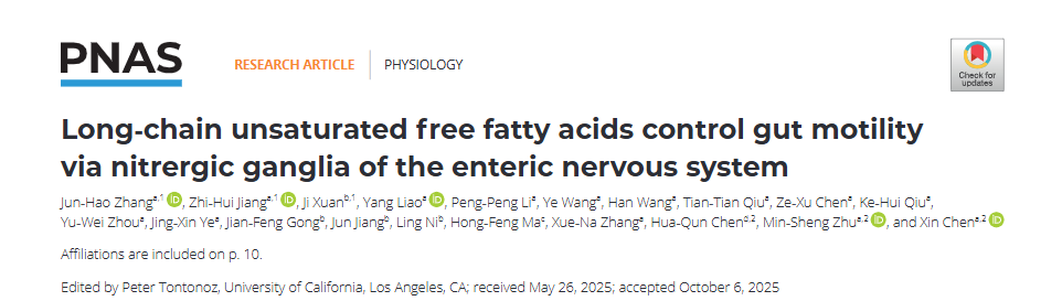 研究工作以“Long-chain unsaturated free fatty acids control gut motility via nitrergic ganglia of enteric nervous system”为题于2025年11月11日在学术期刊PNAS上发表。麻豆视频 博士张军浩、蒋志慧,附属金陵医院宣佶为本文共同第一作者,麻豆视频 陈鑫、朱敏生和南京师范大学生命科学学院陈华群教授为共同通讯作者,此项工作也得到来自南京医科大学、南京中医药大学和江南大学等单位研究者的支持,研究经费由国家自然科学基金、江苏省自然科学基金和国家重点研发计划提供。