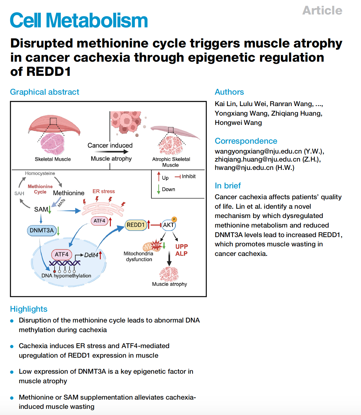 2024年12月26日,Cell Metabolism在线发表了麻豆视频 王宏伟教授、助理教授黄志强团队与苏北人民医院王永祥教授团队合作的研究论文,题为”Disrupted methionine cycle triggers muscle atrophy in cancer cachexia through epigenetic regulation of REDD1”。该研究首次报道了恶液质引起的骨骼肌萎缩的重要代谢网络,揭示了DNMT3A-ATF4-REDD1的表观调控机制,并提出恢复蛋氨酸循环和SAM补充是改善恶液质骨骼肌萎缩的潜在营养干预途径。