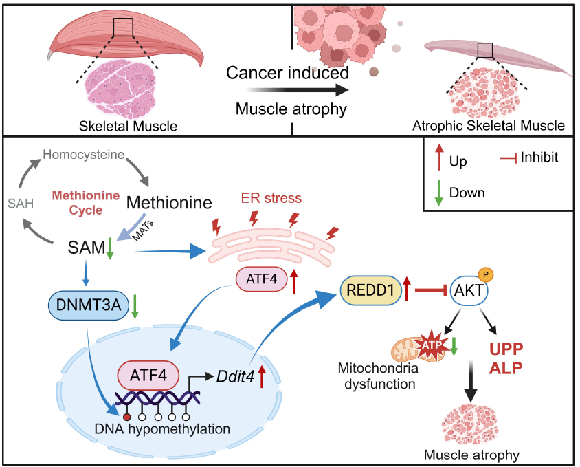 肿瘤恶液质,又称恶病质,是肿瘤患者常见且严重的并发症,表现为体重下降、食欲减退、骨骼肌萎缩和脂肪降解,其显著影响患者生存质量并增加死亡风险。肿瘤恶液质目前缺乏有效的治疗手段,传统营养支持仅能部分缓解症状,因此深入研究其发病机制尤为重要。蛋氨酸作为必需氨基酸,参与蛋白质合成及细胞表观遗传修饰,其代谢产物S-腺苷甲硫氨酸(SAM)在基因表达调控中发挥关键作用。AKT信号通路在调节细胞生长和能量代谢中至关重要,但在恶液质骨骼肌降解过程中,其活化受到抑制。DNA损伤诱导转录因子4(Ddit4,别名:发育与DNA损伤反应调节蛋白1 [REDD1])是调控AKT通路活化的重要抑制因子,其表达水平在恶液质骨骼肌组织中显著增加,抑制REDD1能够显著改善癌症恶病质骨骼肌萎缩,然而,肿瘤恶液质骨骼肌中REDD1表达升高的机制尚不明确。