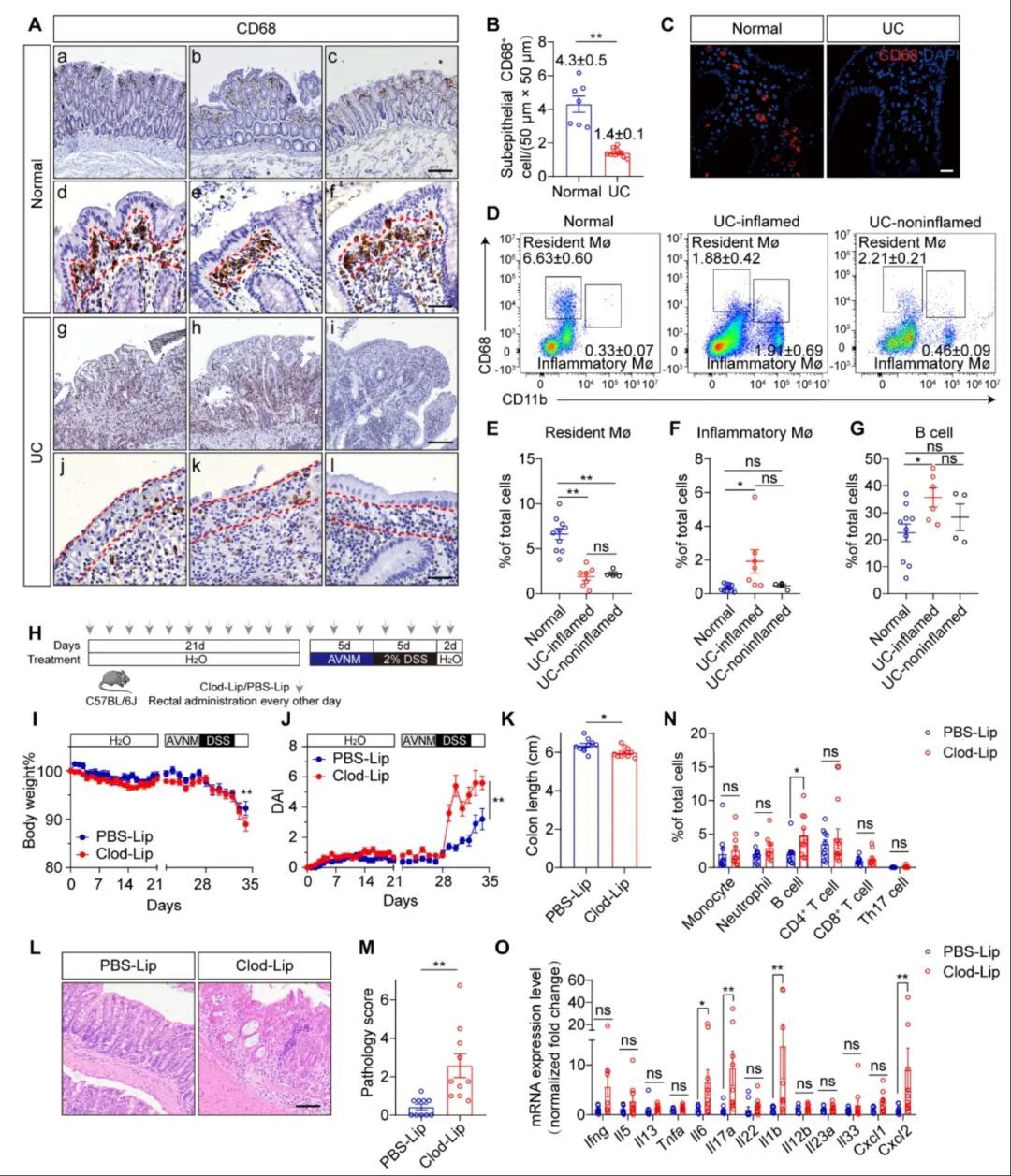 图1.常驻巨噬细胞屏障在UC结肠中缺失,动物模型中该屏障缺失加重DSS肠炎