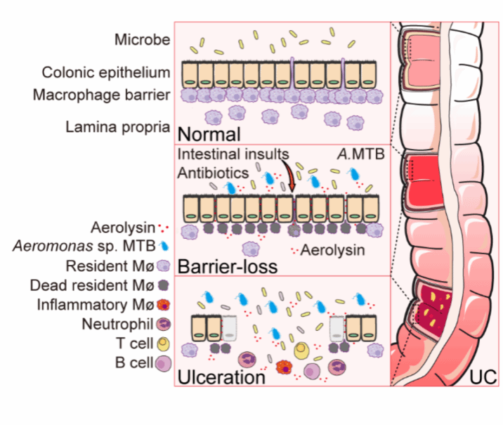 研究团队进一步从UC粪菌中分离获得了产生UC-Aerolysin的病原菌,全基因组测序和生理生化实验显示这些菌株属于气单胞菌属(Aeromonas)的一个新亚种,因它具有破坏巨噬细胞的特性,研究者将其命名为巨噬细胞毒性气单胞菌(Aeromonas sp. MTB)。该菌与其他气单胞菌不同的是具有独特的肠道定植能力,病理因素(如滥用抗生素、肠损伤物质)可促进MTB在肠道内定植,一旦定植,极难清除。即使肠道看似完全恢复,仍持续潜伏在肠道中,在条件适合时可再次活跃增殖。这一特征可以解释为什么人UC反复发作、长年不愈。