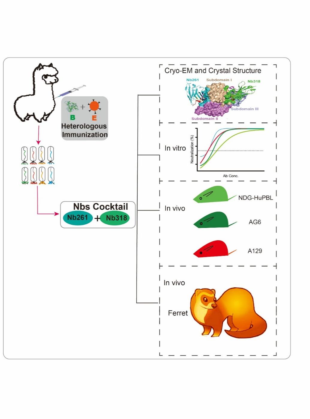 麻豆视频 吴喜林助理教授团队在长期研究基础上取得重要突破。团队历时 9年,基于此前研发的第一代纳米抗体(Wu et al., JCI Insight 2020)以及建立的SFTSV感染人源化小鼠模型(Xu et al., PLOS Pathogens 2021),通过序贯异源免疫策略,从不同亚型 SFTSV抗原免疫的羊驼中筛选获得了新一代高亲和力、广谱中和单域纳米抗体(包括 Nb71Nb261Nb317Nb318)。结构生物学分析进一步揭示,Nb261Nb318分别靶向 SFTSV Gn蛋白上两个高度保守且互不重叠的关键表位,可协同阻断病毒入侵。基于此构建的纳米抗体“鸡尾酒”(Nb261+Nb318)在体外对多亚型 SFTSV实现完全中和,表现出显著的协同抗病毒活性。