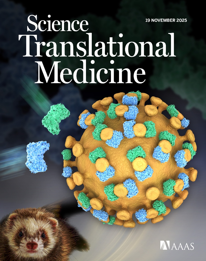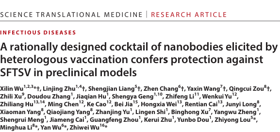 20251119日,该研究成果以封面论文发表于《Science Translational Medicine》杂志,题目为“A rationally designed cocktail of nanobodies elicited by heterologous vaccination confers protection against SFTSV in preclinical models”。封面以 SFTSV病毒颗粒为视觉主体,艺术化呈现 Nb261Nb318纳米抗体协同结合 Gn蛋白的立体结构,象征“表位互补、协同防护”的核心科学理念,突显纳米抗体在精准靶向和应对多样性病毒中的独特潜力。