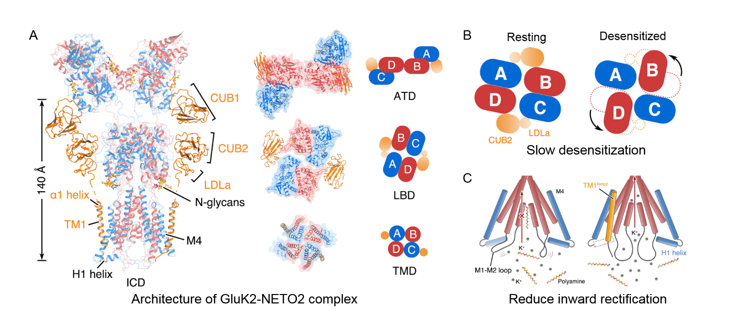 Kanaite受体GluK2形成四聚体的通道结构,包括氨基末端结构域(ATD)、配体结合结构域(LBD)和跨膜结构域(TMD)。复合物结构显示NETO2以化学计量比1:4或2:4结合在GluK2四聚体的一侧或者两侧。辅助亚基NETO2具有可溶的CUB1、CUB2、 LDLa结构域以及一个跨膜螺旋TM1,分别与受体的ATD、LBD和TMD相互作用。电生理实验表明,任意一处相互作用位置的突变都会影响NETO2调控受体的活性。尤其是破坏ATD-CUB1的相互作用,NETO2将彻底失去调控受体活性的功能,这对于理解AMPA受体和Kainate受体中ATD结构域的功能提供了新的启示(图1A-B)。