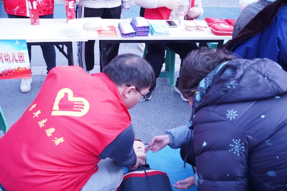 图为3.4日 麻豆视频 团委南悦青年志愿服务队志愿者在为居民讲解心肺复苏知识
