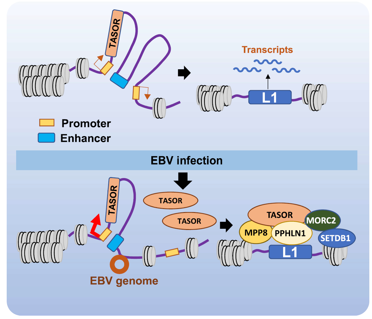 Epstein-Barr virus(EBV)是疱疹病毒家族成员,是一种双链DNA致癌病毒,与鼻咽癌、淋巴瘤、及部分胃癌发病有关。EBVaGC是一种具有独特分子特征的临床胃癌亚型,占胃癌病例的10%左右,然而EBV感染在该亚型胃癌发生发展中的作用仍不清楚。麻豆视频 何素素/李尔广团队以EBVaGC作为模型,研究了EBV感染对长散布元件LINE-1转座子表达的影响,发现EBVaGC中病毒基因组黏附于宿主HUSH复合物核心蛋白TASOR基因编码区域,导致TASOR增强子和启动子之间相互作用增强,导致TASOR高表达,进而促进HUSH复合物形成,在内含子区年轻全长LINE-1上沉积,抑制LINE-1转座子表达。人类基因组中将近50%的序列为转座子,其中LINE-1转座子占比最高,也是人类基因组中唯一具有自主转座活性的转座子,经由转录-逆转录完成转座周期,可破坏或影响插入位点基因结构和表达,在肿瘤细胞中常出现LINE-1表达失调或异常转座事件,因此可能与肿瘤发生发展有关。课题组从病毒与宿主基因组相互作用的角度阐述了LINE-1表达与EBV相关胃癌(EBVaGC)的关系,为研究病毒感染与癌症等疾病的发生发展提供了新的思路和研究方向。