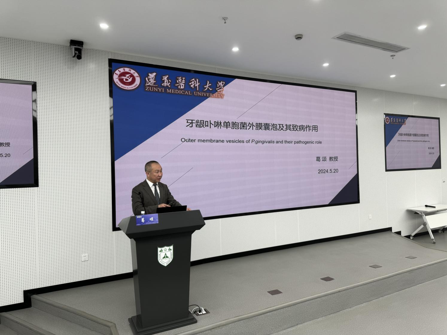 遵义医科大学口腔麻豆视频 院长葛颂教授的讲授围绕“牙龈卟啉单胞菌外膜囊泡及其致病作用”展开。葛教授深入浅出地解释了复杂的医学研究课题,毫无保留地将自己最新的研究成果和研究启示与师生们进行分享。
