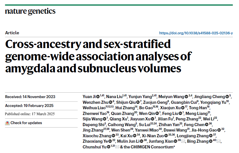 2025年3月17日,Nature Genetics在线发表了麻豆视频 张冰教授,首都医科大学附属北京同仁医院鲜军舫教授,和天津医科大学总医院于春水教授团队合作的研究论文,题为“Cross-ancestry and sex-stratified genome-wide association analyses of amygdala and subnucleus volumes”。该研究首次系统性解析了杏仁核及其亚核体积的跨祖先、跨性别遗传异质性,为杏仁核相关神经-精神疾病的精准诊疗提供了新见解。