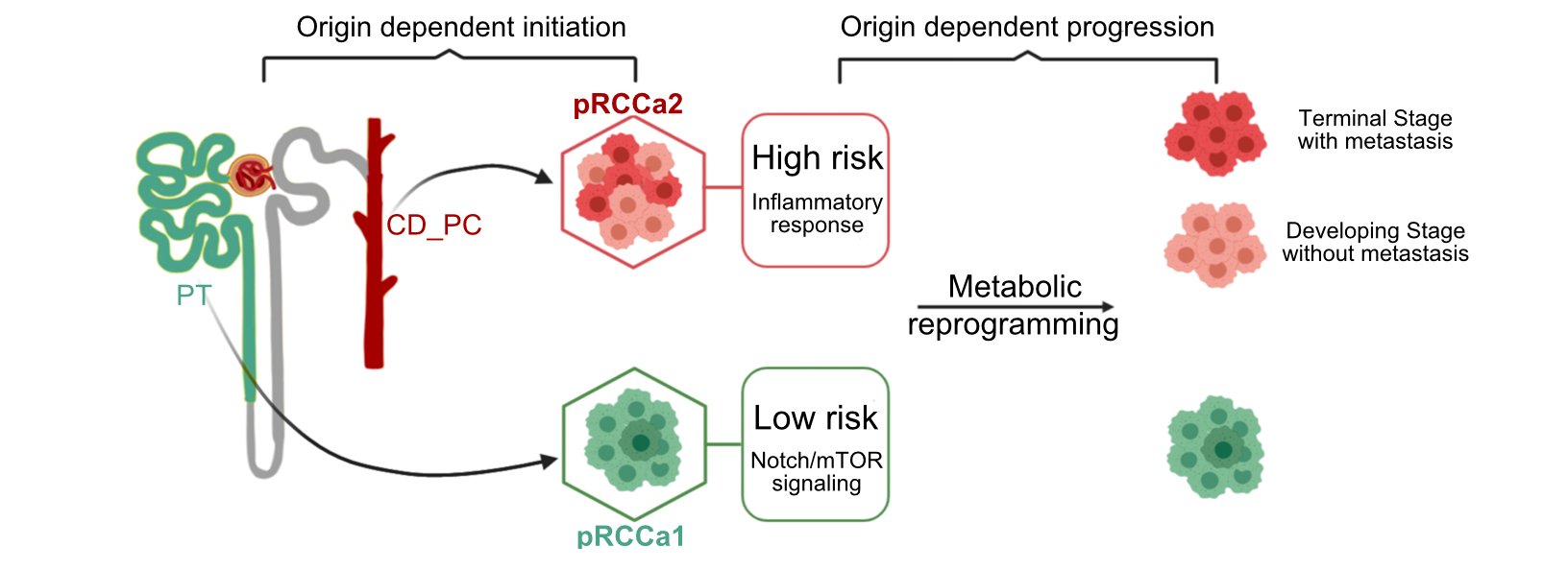 有意思的是,通过与识别出的精准细胞源头相比较,不同来源的变异细胞显示出不同的转变路径。来源于近端小馆的异常细胞表现为NOTCH和mTOR信号通路的激活,而源自远端集合管的变异细胞则呈现出独特的炎症和免疫相关通路激活。恶性肾乳头癌细胞转变中mTOR激活证据的缺失,也解释了临床上常规治疗方法如VEGF-和mTOR导向疗法以及干扰素-α,对于晚期肾乳头癌患者治疗获益较小的问题。同时,团队的研究结果也提示免疫检查点抑制剂可能会为此类异变的患者带来更加良好的临床获益。