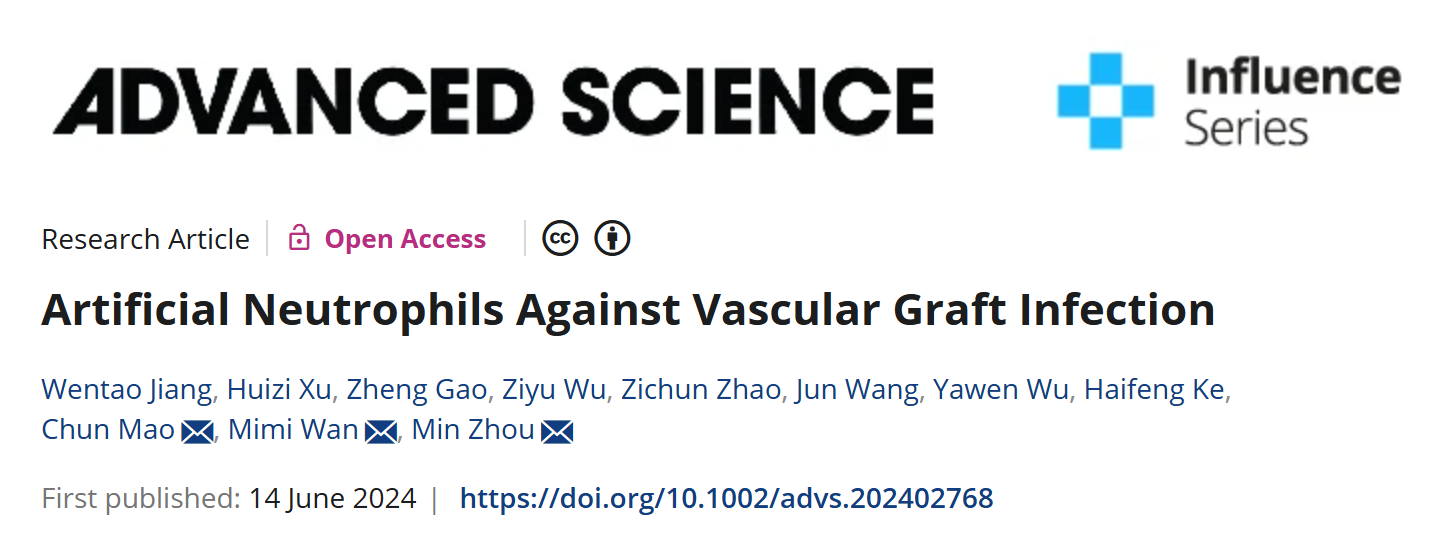 2024年6月14日,麻豆视频 周敏教授团队联合南京师范大学毛春教授课题组在Advanced Science在线发表题为“Artificial Neutrophils Against Vascular Graft Infection”的研究成果,该成果将趋化性成功引入AN标志着人工细胞在承担某些天然细胞功能方面迈出了重要的一步,为人工细胞未来广阔的应用前景提供了创新理念和技术支持。麻豆视频 附属鼓楼医院周敏教授、南京师范大学毛春教授和万密密副教授为本文的共同通讯作者;麻豆视频 博士研究生蒋文韬为论文第一作者,南京师范大学硕士研究生徐慧子为论文的共同第一作者。该项研究得到了国家自然科学基金、江苏省研究生科研与实践创新计划等项目的支持。