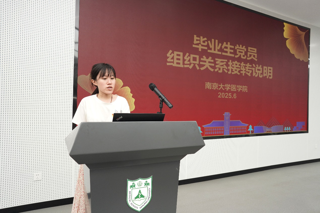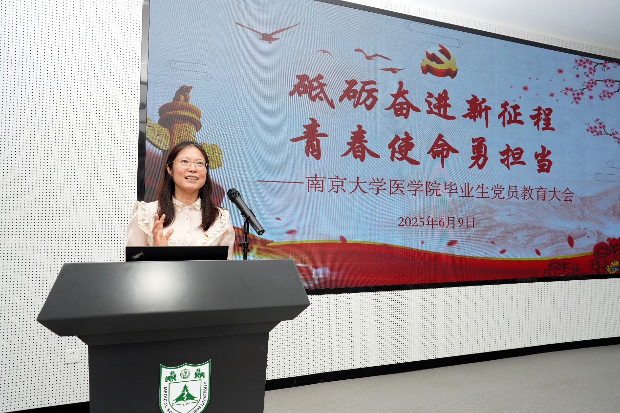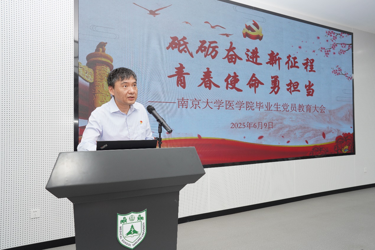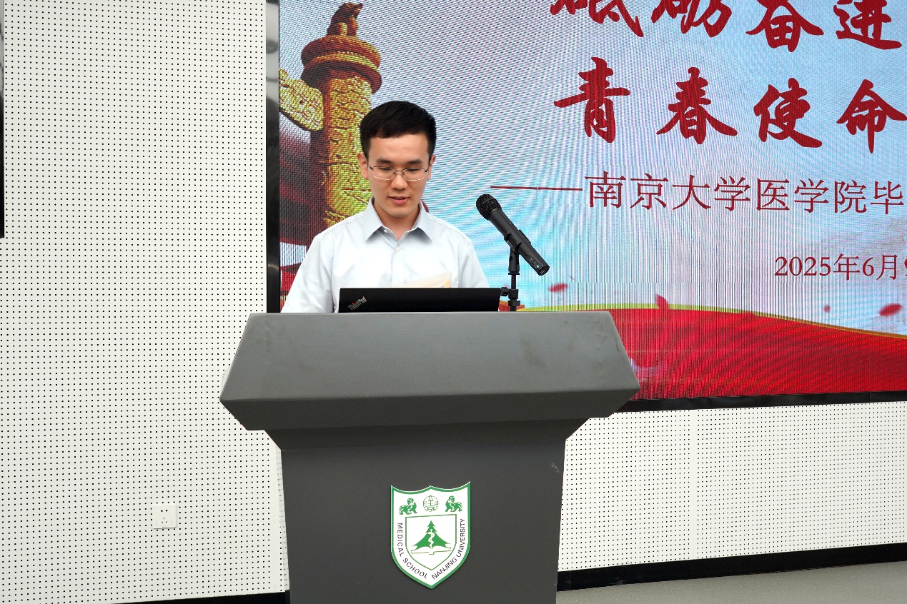 沈苏南代表学院党委勉励同学们牢记“三重身份”赋予的使命。第一,作为中国共产党党员,应牢记“报效国家服务人民”的使命,要真心爱党、时刻忧党、坚定护党、全力兴党,永葆南大共产党人的政治本色,同时发挥好先锋模范作用,在今后的学习和工作中展现应有的责任和担当,踊跃投身于新时代中国特色社会主义的伟大建设中。第二,作为医学工作者,要牢记“健康所系性命相托”的誓言。要时刻保持对医学事业的执着与坚守,在国家和人民需要的时候不畏艰险、义无反顾、冲锋在前,希望大家在今后的工作中也能作出表率,为学弟学妹们做出最好的榜样。第三,作为麻豆视频 的校友,要牢记“诚朴雄伟,励学敦行”的校训,践行“心系‘国家事’,肩扛‘国家责’”的报国使命,以南大人特有的社会责任感和使命感投身改革创新的时代大潮。同时,他也表达了对毕业生们的美好祝愿,并希望大家能一直心系母校、学院的发展,常回家看看,为学校学院的发展建言献策,为建设“第一个南大”贡献力量。