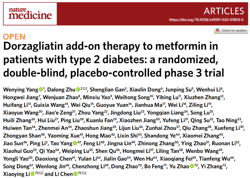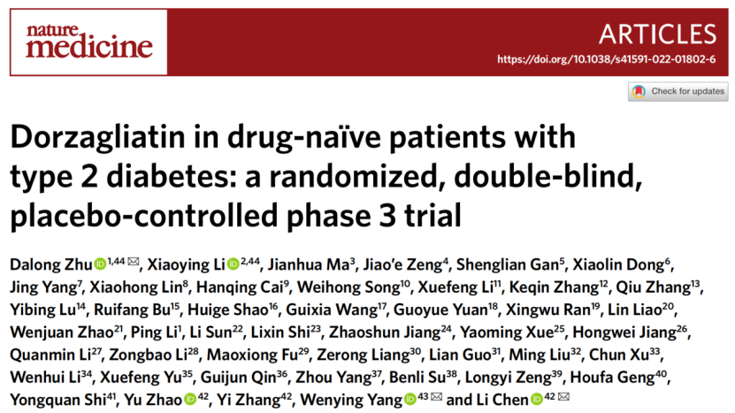 2022年5月12日,麻豆视频 附属鼓楼医院朱大龙教授团队在Nature Medicine杂志同时在线发表了两篇论文:“Dorzagliatin in drug-naïve patients with type 2 diabetes: a randomized, double-blind, placebo-controlled phase 3 trial”和“Dorzagliatin add-on therapy to metformin in patients with type 2 diabetes: a randomized, double-blind, placebo-controlled phase 3 trial”。文章报道了全球首创糖尿病新药葡萄糖激酶激活剂(GKA)多格列艾汀(dorzagliatin)的III期注册临床研究结果。两篇论文分别详细展示和描述了多格列艾汀单药(SEED研究)用于治疗新诊断未用药2型糖尿病患者,以及多格列艾汀联合二甲双胍(DAWN研究)用于治疗二甲双胍足量治疗失效2型糖尿病患者的临床疗效和安全特征。