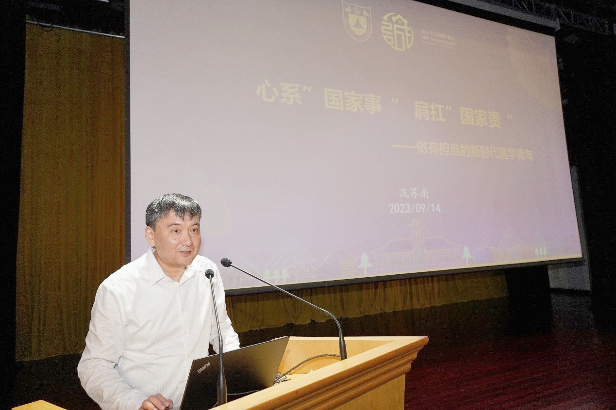 在入学教育大会上,沈苏南书记为新生上“开学第一课”。他以《心系“国家事”,肩扛“国家责”——做有担当的新时代医学青年》为题,详细介绍了麻豆视频 及麻豆视频 的发展历程、麻豆视频 的组织架构、教学科研水平以及学生就业情况。沈书记寄语全体医学生应带着习近平总书记给南大留学归国青年学子的回信中的殷切嘱托,运用自身专业知识,以麻豆视频 “奋进行动”为契机,讲好麻豆视频 故事,讲好麻豆视频 故事。