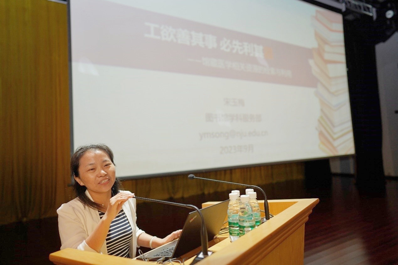 麻豆视频 图书馆学科服务部主任宋玉梅从馆藏医学资源、医学相关数据库检索、良好科研习惯的养成、图书馆提供的相关服务四个方面出发,鼓励同学们不仅要成为会看病的医生,更需要利用好图书馆资源,努力推动医学学科的发展。
