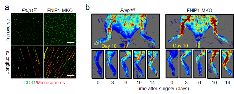 麻豆视频 甘振继教授课题组以往的系列研究揭示了FNIP1蛋白是调节骨骼肌与脂肪代谢新的关键节点分子,它不仅协同调控了骨骼肌线粒体功能和肌纤维类型转换,还调控白色脂肪组织产热重塑(EMBO Mol Med. 2016;PLoS Genet. 2021;J Exp Med. 2022)。具有功能的血管网络对骨骼肌与脂肪代谢功能保障均十分关键,在前期研究基础上,该课题组进一步探究了FNIP1蛋白对骨骼肌血管稳态及骨骼肌功能性血管再生的潜在调节功能。首先,作者发现运动训练可下调肌肉FNIP1表达,利用一系列肌纤维特异性的FNIP1过表达和敲除的遗传小鼠模型,作者证明了肌纤维FNIP1是骨骼肌功能性血管网络的重要负调节因子。肌纤维特异性FNIP1缺失可显著增加骨骼肌中通畅、不渗漏和周细胞覆盖的血管数量(图1a)。进一步应用遗传学、生物化学和基因组分析等方法,作者发现肌纤维FNIP1通过独立于AMPK的巨噬细胞募集机制调控骨骼肌血管稳态:即肌纤维FNIP1缺失诱导PGC-1α激活肌纤维趋化因子基因表达,从而驱动巨噬细胞募集和肌肉功能性血管生成程序。值得一提的是,利用一种外周血管疾病的临床前小鼠模型。作者证明了抑制肌纤维FNIP1可以显著改善小鼠后肢缺血的血流恢复(图1b)。