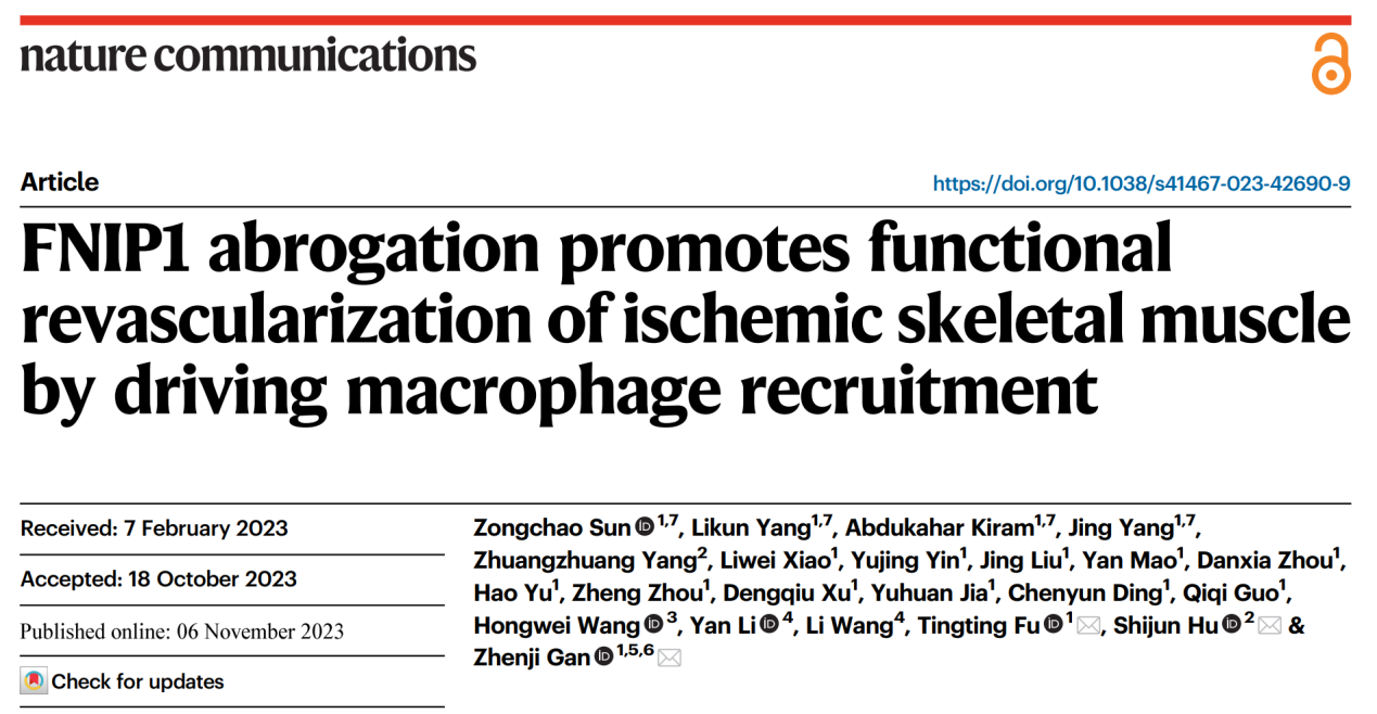 2023年11月6日,麻豆视频 甘振继教授课题组联合苏州大学胡士军教授课题组在Nature Communications长文发表了题为“FNIP1 abrogation promotes functional revascularization of ischemic skeletal muscle by driving macrophage recruitment”的研究成果。麻豆视频 博士研究生孙宗超、杨立坤、阿布都哈卡尔·克拉木、杨静为本文的共同第一作者。麻豆视频 甘振继教授、苏州大学胡士军教授及麻豆视频 付婷婷副研究员为本文的共同通讯作者。共同作者里还有麻豆视频 的王宏伟教授,江南大学的李言教授和王立教授等。研究得到合作实验室的大力协助与支持。上述研究得到了中国科学技术部、国家自然科学基金委、教育部、江苏省科技厅以及中央高校等基金的支持。