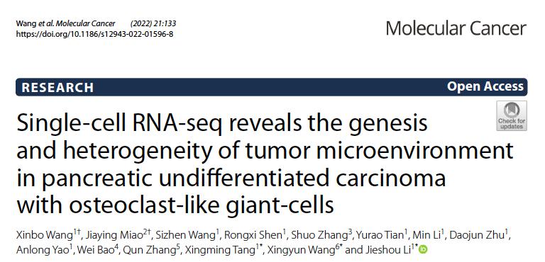 上述研究成果“Single-cell RNA-seq reveals the genesis and heterogeneity of tumor microenvironment in pancreatic undifferentiated carcinoma with osteoclast-like giant-cells”已于2022年6月23日在线发表于国际肿瘤生物学领域顶尖期刊《Molecular Cancer》杂志上。论文的通讯作者为麻豆视频 附属金陵医院黎介寿院士、唐星明教授和上海交通大学王星云教授,第一作者为王新波教授,数名院内胆胰肿瘤多学科综合诊疗协作组成员是重要参与者,研究工作得到了任建安教授、朱维铭教授的大力支持以及国家重点临床专科-普通外科建设项目、江苏省临床医学中心创新平台等项目的经费资助。