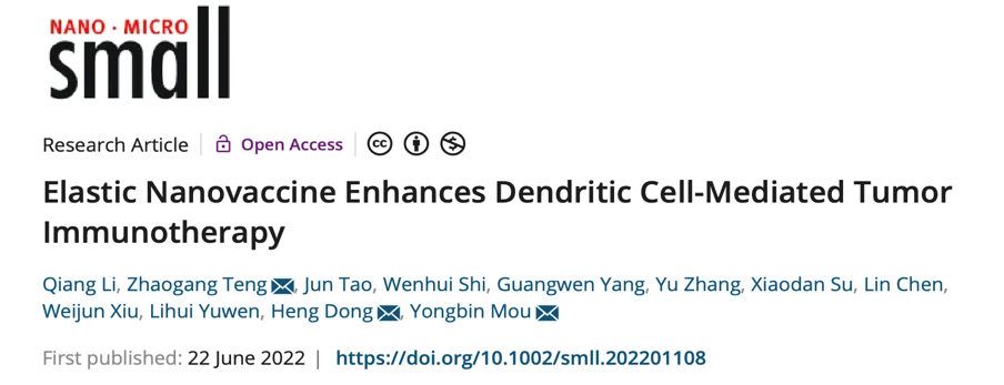 上述研究成果“Elastic Nanovaccine Enhances Dendritic Cell-Mediated Tumor Immunotherapy”已于2022年6月22日在线发表于国际知名期刊《Small》,并被遴选为《Small》该期封底内页(Inside Back Cover)论文。论文通讯作者为麻豆视频 附属口腔医院牟永斌教授、南京邮电大学滕兆刚教授以及麻豆视频 附属口腔医院董衡医生,第一作者为麻豆视频 博士研究生李强。该研究受到国家自然科学基金面上项目、江苏省重点研发计划(社会发展)项目、江苏省自然科学基金、南京市卫生科技发展专项资金项目计划等基金资助。