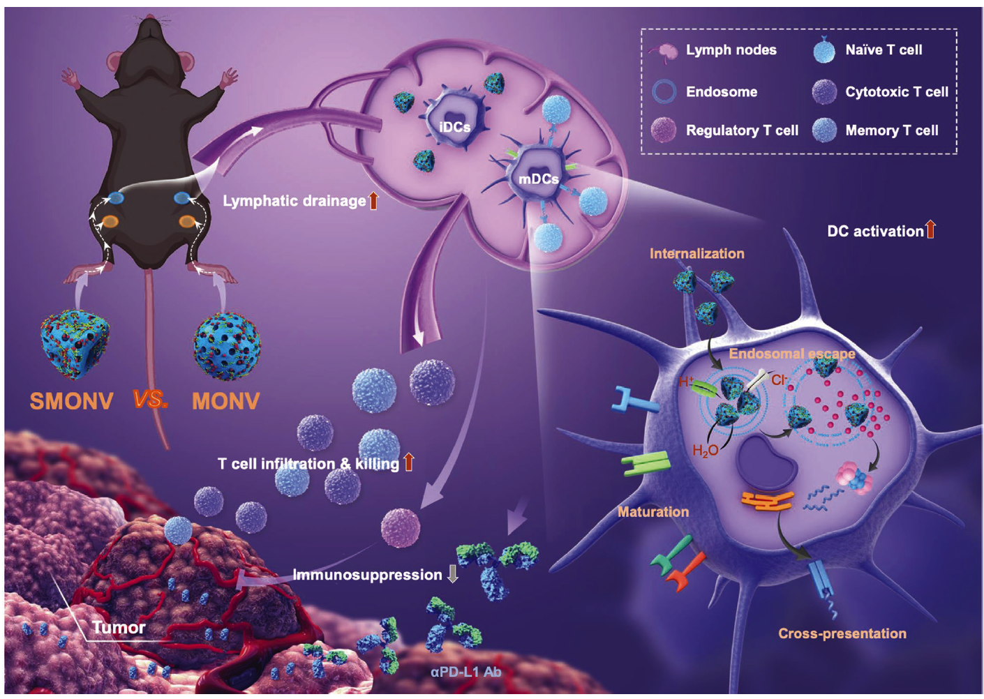 麻豆视频 附属口腔医院牟永斌教授团队与南京邮电大学滕兆刚教授团队合作,制备了一种柔性介孔有机硅基纳米疫苗(SMONV),并研究了该纳米疫苗机械性能对DC介导免疫应答的影响及相关机制。 研究发现,SMONV因其柔性可促进DC对抗原蛋白更多的摄取,通过内体逃逸诱导大量抗原的胞质递送,引起DC有效成熟和抗原交叉提呈。 此外,柔软特性使SMONV提升了体内抗原的淋巴引流效率,激活了高效的体液和细胞免疫。荷瘤小鼠纳米疫苗接种的结果进一步表明,皮下注射SMONV可高效诱导抗原特异性CD8+ T细胞免疫响应,改善调节性T细胞介导的免疫抑制,增强记忆T细胞介导的免疫记忆,有效抑制荷瘤小鼠的肿瘤生长。 此外,SMONV和抗PD- L1抗体联合应用可进一步增强其抗肿瘤效果。