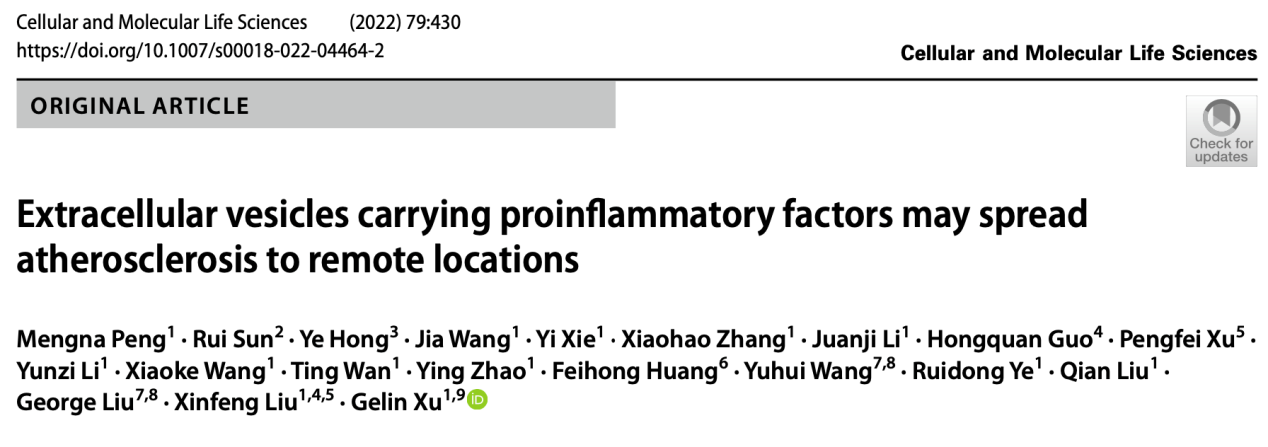 上述研究成果“Extracellular vesicles carrying proinflammatory factors may spread atherosclerosis to remote locations”于2022年7月18日在线发表于综合性期刊《Cellular and Molecular Life Sciences》。麻豆视频 彭蒙娜博士等为该研究论文的第一作者,徐格林教授、刘新峰教授为共同通讯作者。该研究与北京大学心血管研究所刘国庆教授、王宇辉副研究员合作完成。感谢国家自然科学基金对本研究的资助。