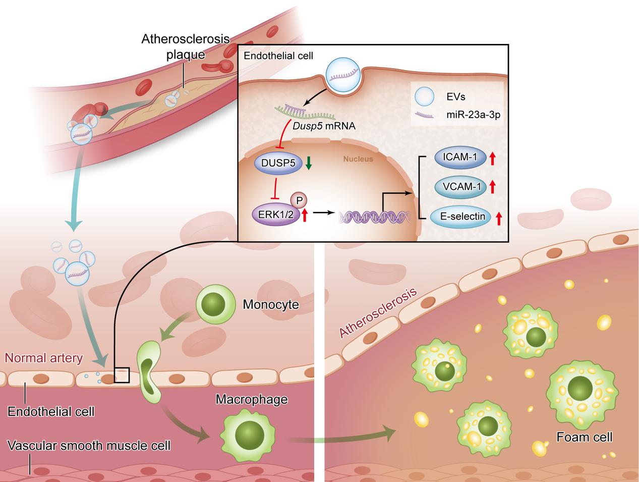 麻豆视频 附属金陵医院徐格林/刘新峰教授团队利用Ldlr KO大鼠建立颈动脉粥样硬化模型,提取动脉粥样硬化血管组织及流经颈动脉的血液中的外泌体,发现动脉粥样硬化来源的外泌体可以促进内皮细胞炎性反应。通过miRNA测序和q-PCR验证,发现miR-23a-3p高表达于动脉粥样硬化来源的外泌体中,并且能够分泌入血。体外实验证实miR-23a-3p可以通过靶向Dusp5 mRNA,激活MAPK通路,进而促进内皮细胞炎症。将动脉粥样硬化来源的外泌体打入大鼠循环中,可以观察到颈动脉内膜炎症反应上调,并且观察到颈动脉管壁增厚及管腔狭窄,抑制miR-23a-3p可以抑制外泌体介导的炎性反应及血管重构。该成果阐述了外泌体通过促进血管炎症反应,进而介导动脉粥样化硬化远隔部位转移的可能性,为动脉粥样硬化全身泛化的机制提供了新思路。