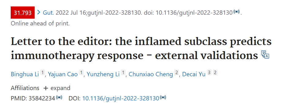 近日,麻豆视频 附属鼓楼医院余德才教授团队通过转录组测序(n=41),在亚洲肝癌人群中验证了Inflamed class可以预测肝癌患者PD1抑制剂治疗的疗效,并进一步证实该结论可以推广到泛肿瘤。该研究结果以研究性letter的形式发表于同刊,麻豆视频 附属鼓楼医院博士后黎兵华为第一作者,余德才教授为通讯作者。该工作得到了国家自然科学基金青年和面上项目的资助。