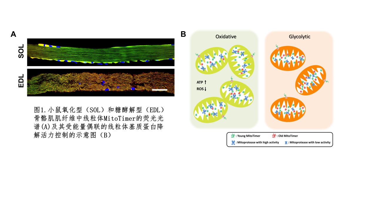 Timer是一个早年建立的荧光光谱可在一定时间内发生特定转换的荧光蛋白(定义为由绿色荧光转换为红色荧光),MitoTimer则是能够定位于线粒体基质的Timer蛋白。将Timer(MitoTimer)在细胞中表达后,虽然Timer的两种荧光光谱似乎能反映细胞(或线粒体)中“新”、“老”Timer蛋白的构成,但其整体荧光光谱(红绿比)可能受到多种因素的影响,Timer的这种随时间改变光谱的特性或Timer的荧光光谱用于研究生物学过程的最佳场景尚不明确。麻豆视频 模式动物研究所的刘耕课题组通过建立MitoTimer的小鼠报告系统并解析生理稳态下小鼠骨骼肌中MitoTimer的荧光光谱,首次发现处于不同氧化代谢水平的骨骼肌组织和肌纤维中MitoTimer荧光光谱存在巨大差异(如:氧化代谢旺盛的慢肌纤维以绿色荧光为主,而以糖酵解为主要代谢模式的快肌纤维则以红色荧光为主)。同时,年轻小鼠以及锻炼后小鼠骨骼肌MitoTimer均呈现偏绿荧光光谱。在细胞体系中,提升氧化代谢水平同样能促进MitoTimer偏绿光谱的呈现。进一步的研究排除了线粒体自噬以及生物合成等多种因素对氧化状态下MitoTimer荧光光谱的影响,揭示线粒体基质蛋白水解酶的活力直接影响了MitoTimer的降解速率,尤其是MitoTimer红色荧光的强度,是决定MitoTimer荧光光谱的主要因素,而这种“新”、“老”蛋白降解动力学的内在区别可能正是Timer特性的在活细胞中的反映。重要的是,线粒体蛋白酶活力、MitoTimer以及线粒体呼吸链蛋白降解和更新都与线粒体能量状态和水平紧密偶联。因此,偏绿的MitoTimer荧光光谱界定和指示了线粒体的一种活跃状态,即特定氧化代谢状态下供能效率的提升(高氧化磷酸化水平)。线粒体蛋白酶作为线粒体重要的质量控制系统,负责线粒体电子传递链蛋白复合体的组装以及损伤蛋白的清除等功能,因此该研究的发现提示线粒体高氧化磷酸化状态存在正向反馈的维持机制。更多实验结果也证实这种线粒体的活跃状态反而伴随着较低活性氧/氧化损伤以及线粒体自噬水平,显示出线粒体代谢适能的特定状态。综上,MitoTimer偏绿荧光光谱的解析揭示了与线粒体高水平氧化磷酸化状态相偶联的质量控制机制,并指示高效而低氧化损伤的特定线粒体活跃状态。